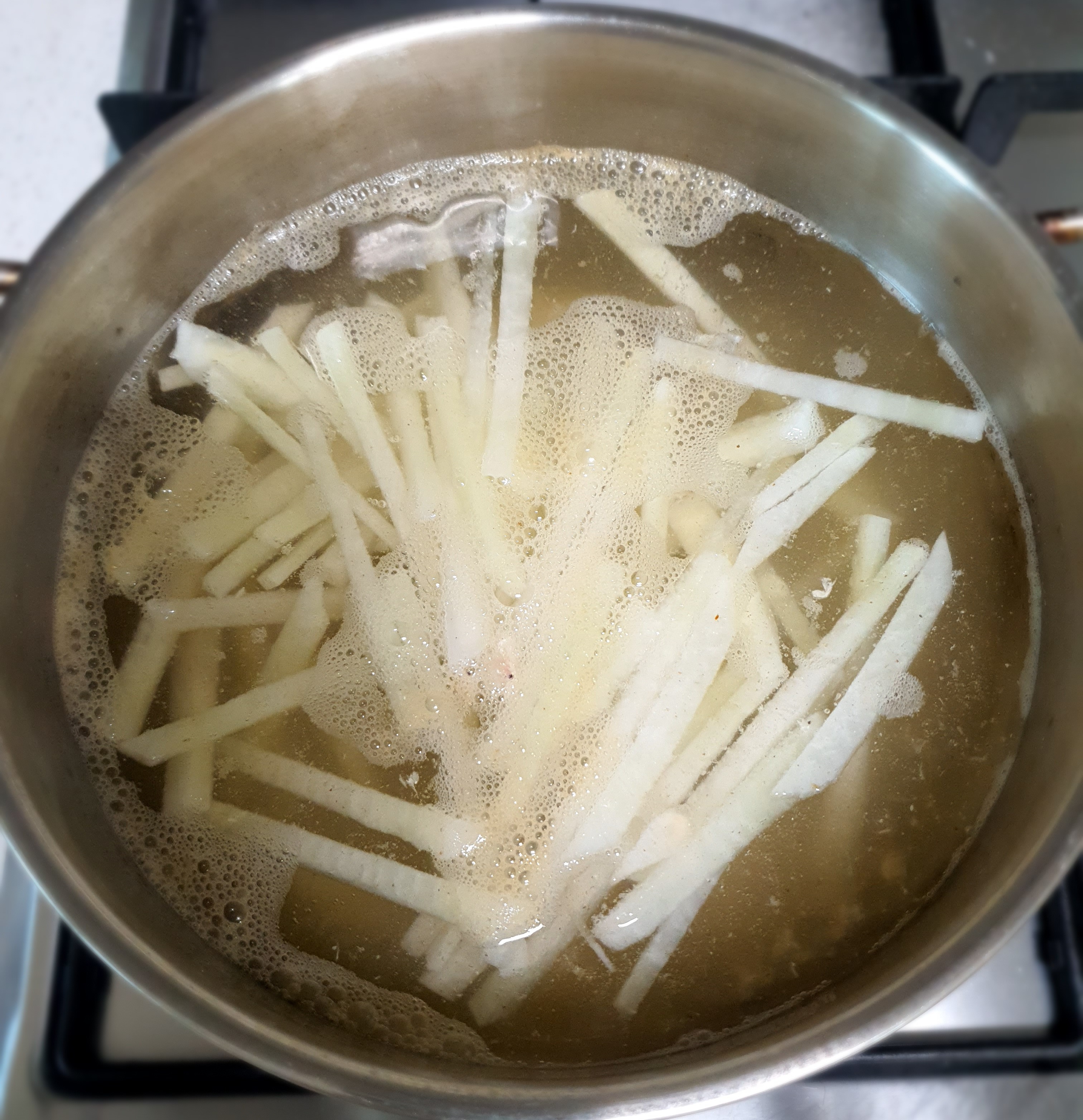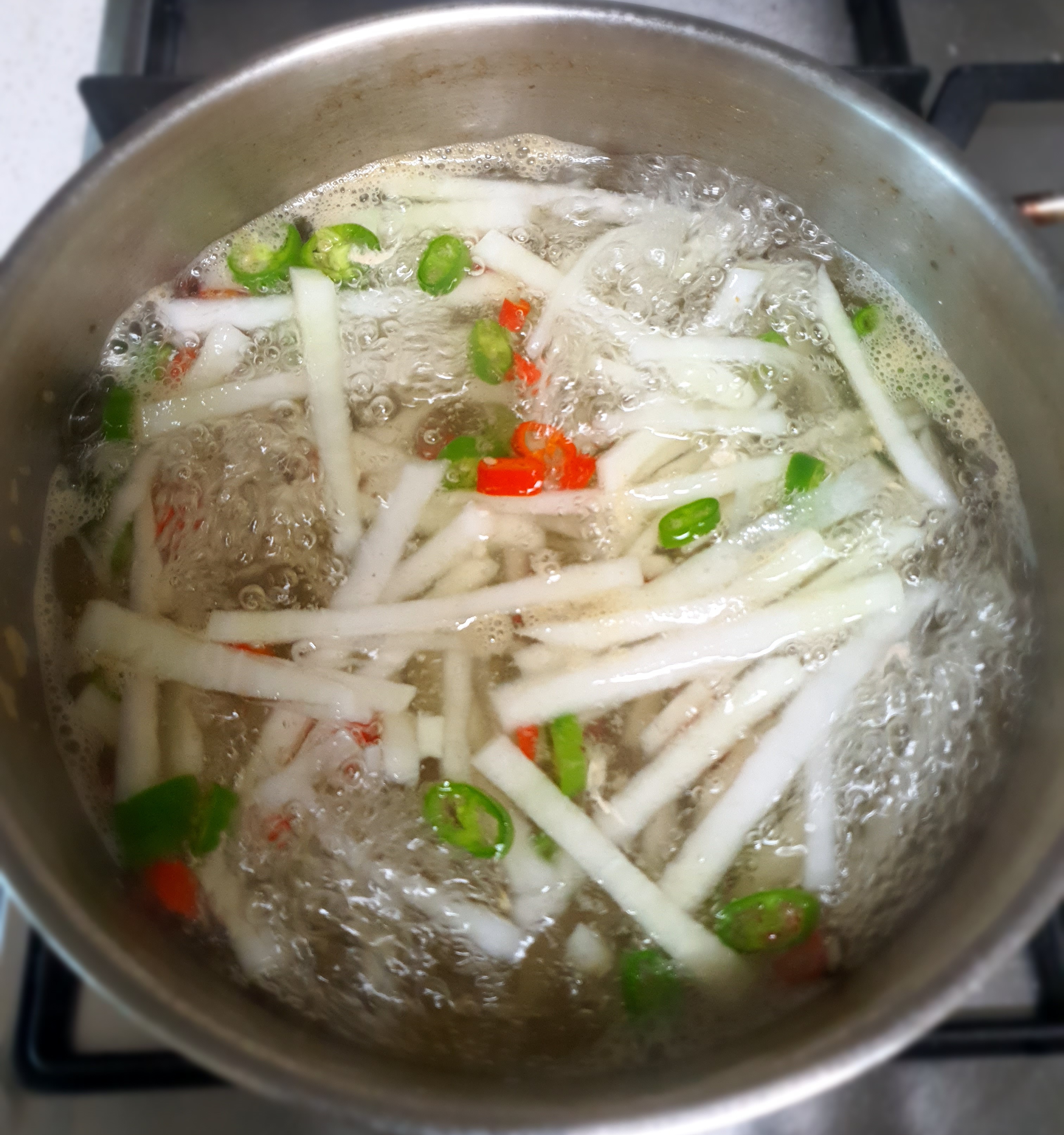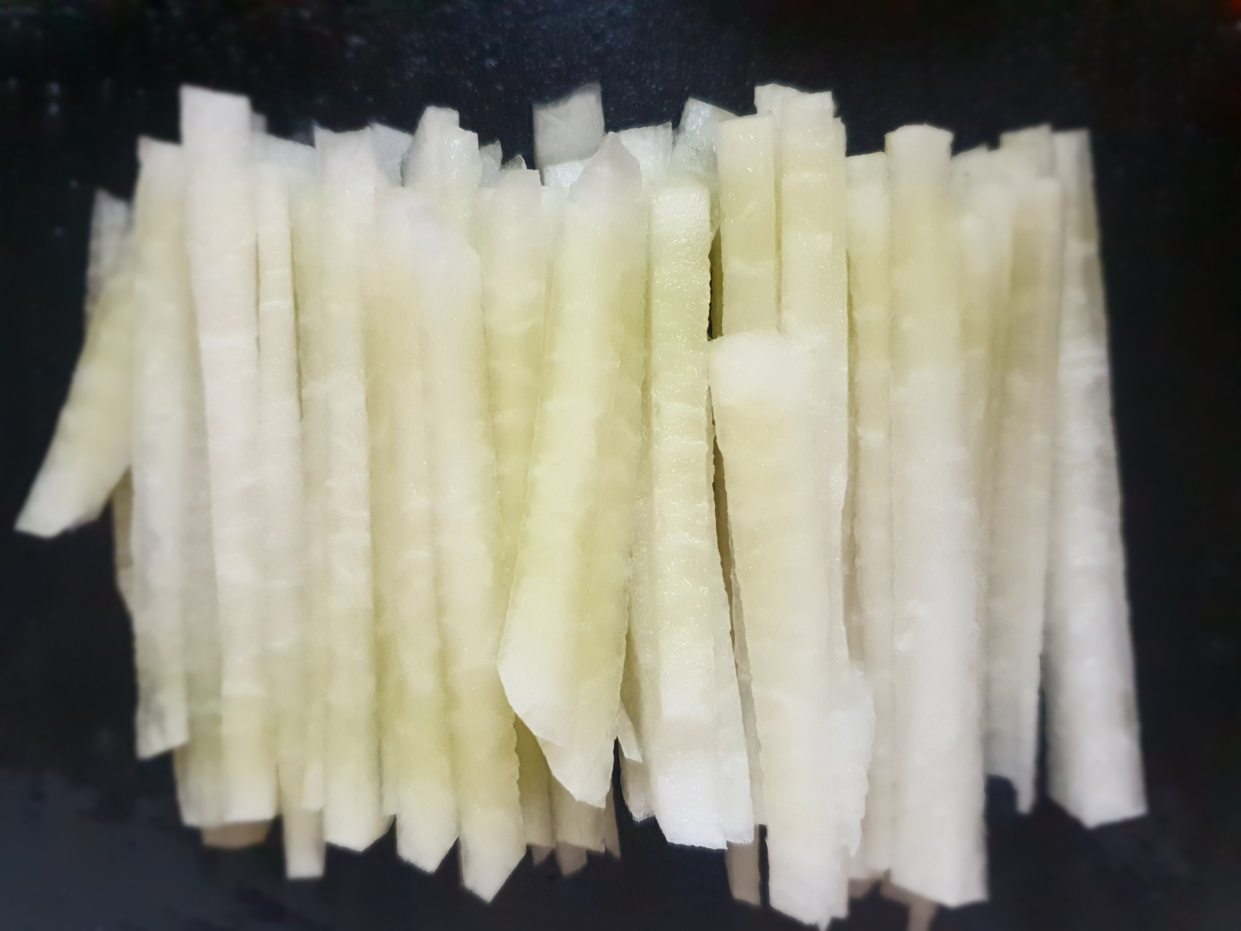 무는 빨리 익을 수 있도록 채를 썰어요.