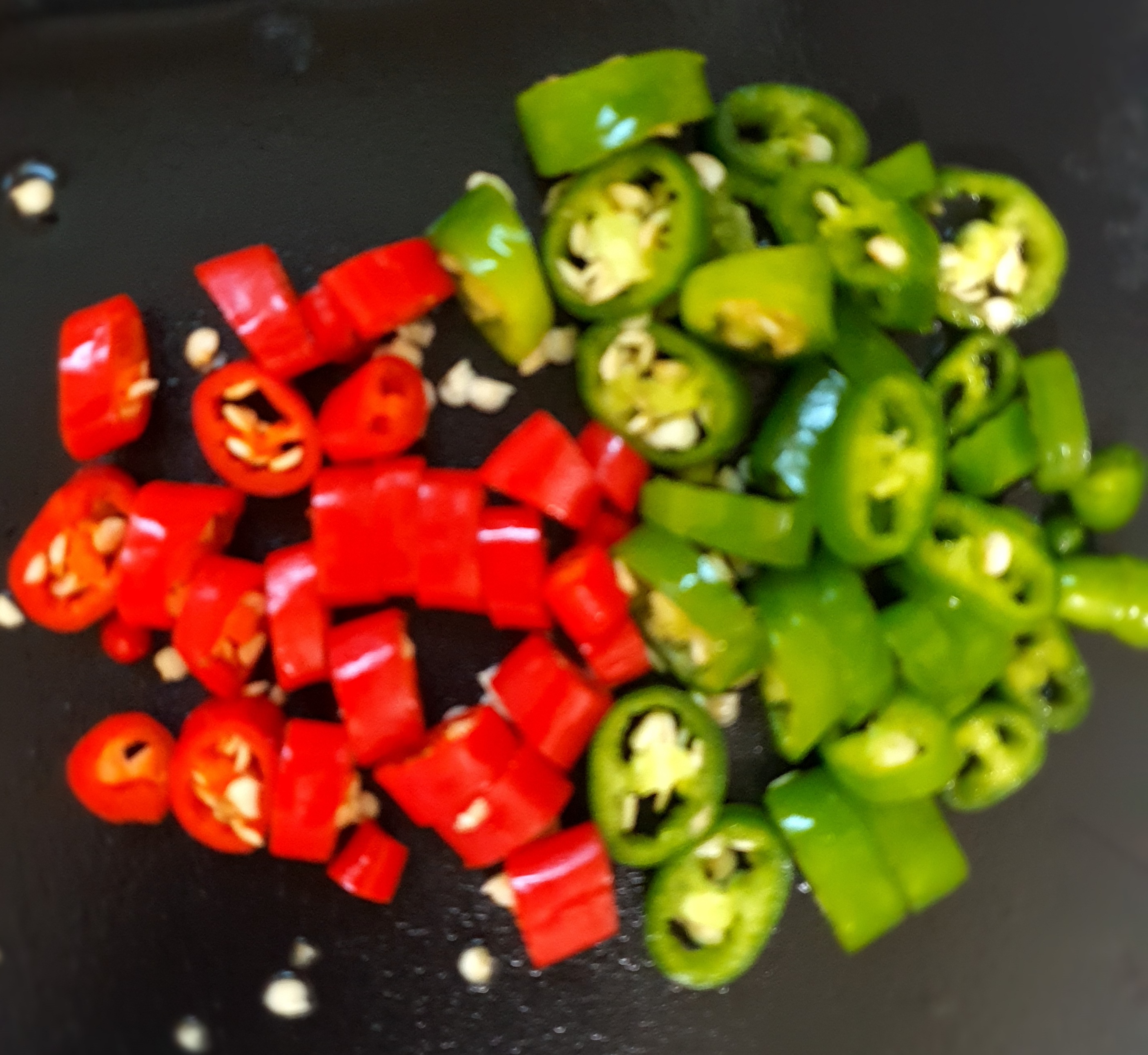썰어놓은 청양고추, 홍고추를 넣었어요.