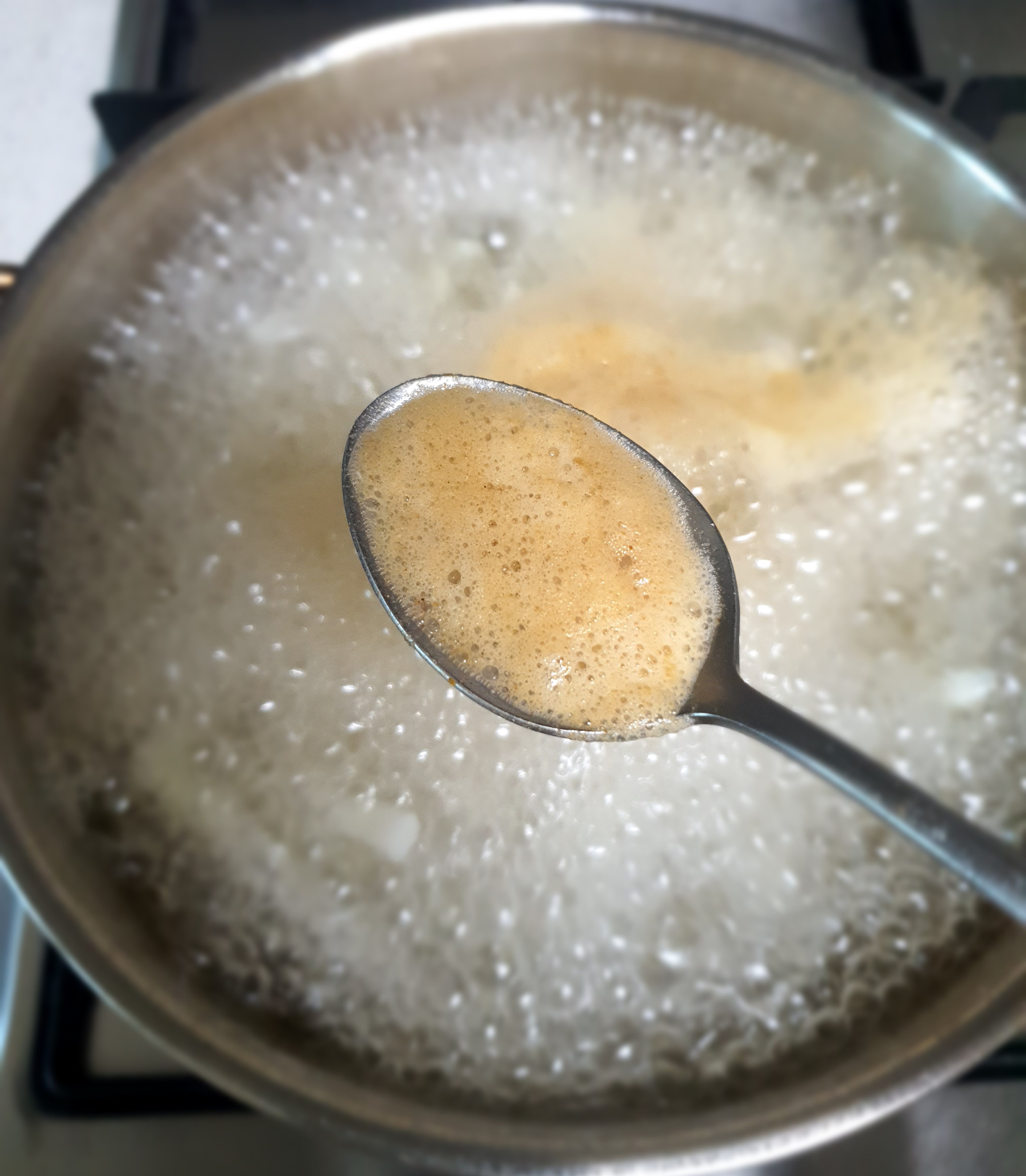 지저분해 보이는 거품은 숟가락으로 걷어요.