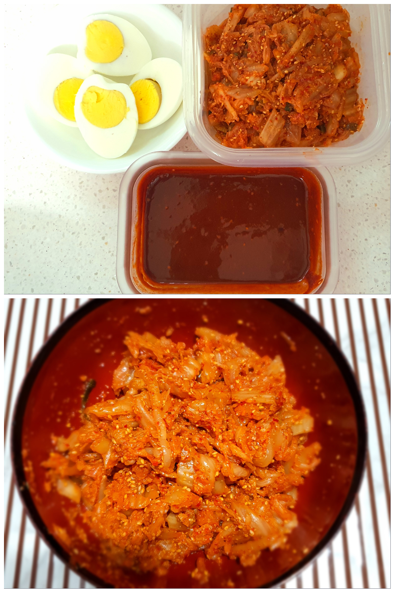 5. 김치: 김치는 송송 썰어서 물기를 쫙 빼줍니다. 그 후 다진 마늘 한 스푼, 설탕 조금, 참기름 살짝 떨어뜨려 조물조물 무쳐놓습니다.