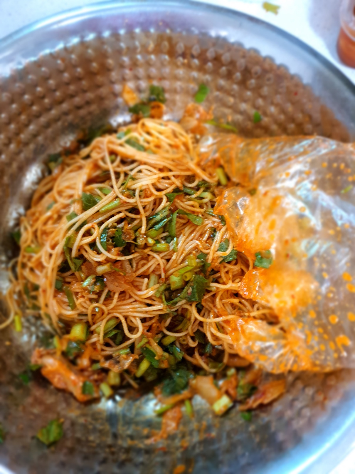 ● 이제는 국수를 비벼줘야겠죠.ㅎㅎ 행복한 순간! 삶아서 물기를 뺀 중면에 만들어 놓은 양념장을 넣고, 맛있게 무쳐 놓은 김치도 넣고, 송송 썰은 미나리도 넣고 비닐장갑을 끼고 비벼줘야죠. 비비다 한 입 먹어보고 ㅎㅎ 김치 버무릴 때 참기름을 넣어서 면 비빌때에 참기름은 아주 살짝만 넣었습니다. 많이 넣으면 느끼해요.