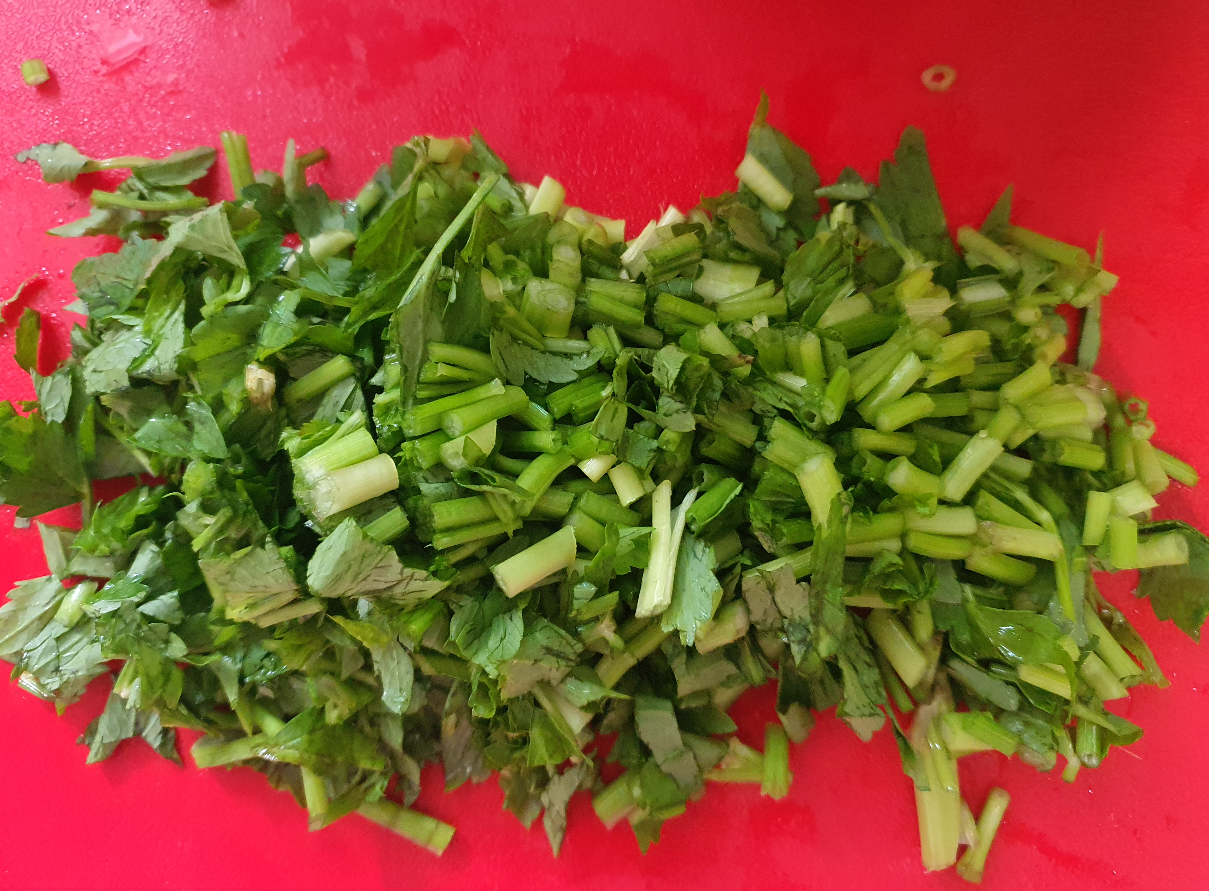 ● 미나리는 깨끗이 씻은 후 먹기 좋은 크기로 송송 썰어줍니다. 길이는 취향 껏 조절하시면 되는데 길면 좀 질긴 감이 있어서 송송 썰었습니다.