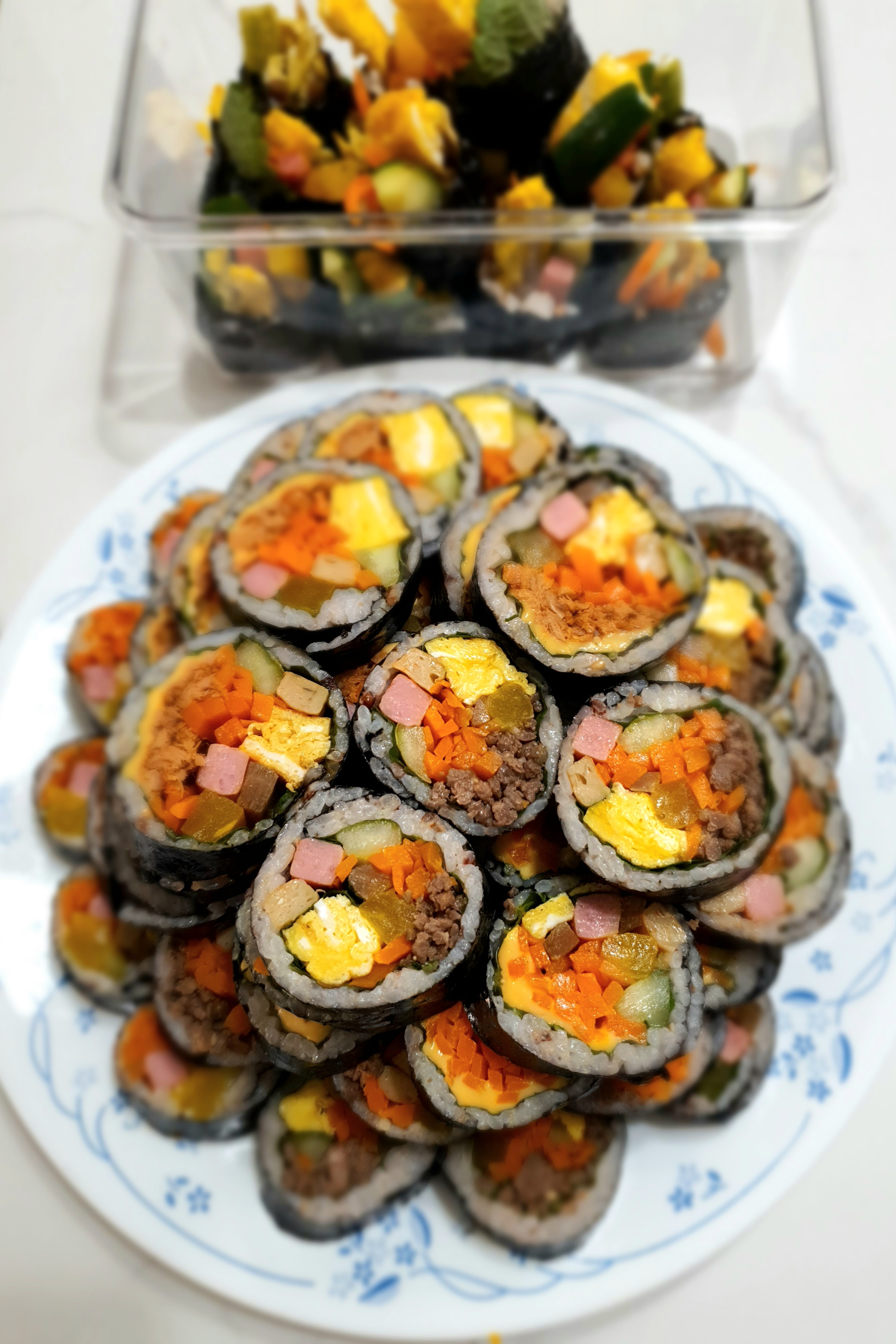 * 재료: 김밥 김, 당근 6개, 오이 2개, 계란 6개~8개, 깻잎 20장, 다진 소고기 300그램, 김밥 햄, 김밥 어묵, 단무지, 우엉, 체다치즈, 고추 참치 캔, 밥, 참기름, 소금, 깨, 진간장, 다진 마늘, 설탕, 후추, 맛술, 식초, 오일