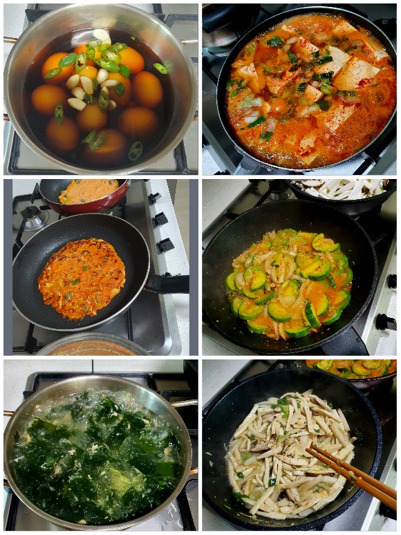 계란장조림, 두부조림, 김치전, 애호박조림, 미역국, 새송이버섯볶음. 새송이볶음 맛이 2% 부족한 것 같아서 다시다 넣었더니 ㅎㅎㅎ 미친 맛이 되었어요^^ 다시다는 역시 마법의 가루네요! 반찬 몇 가지 하고 폭풍 설거지 했어요.